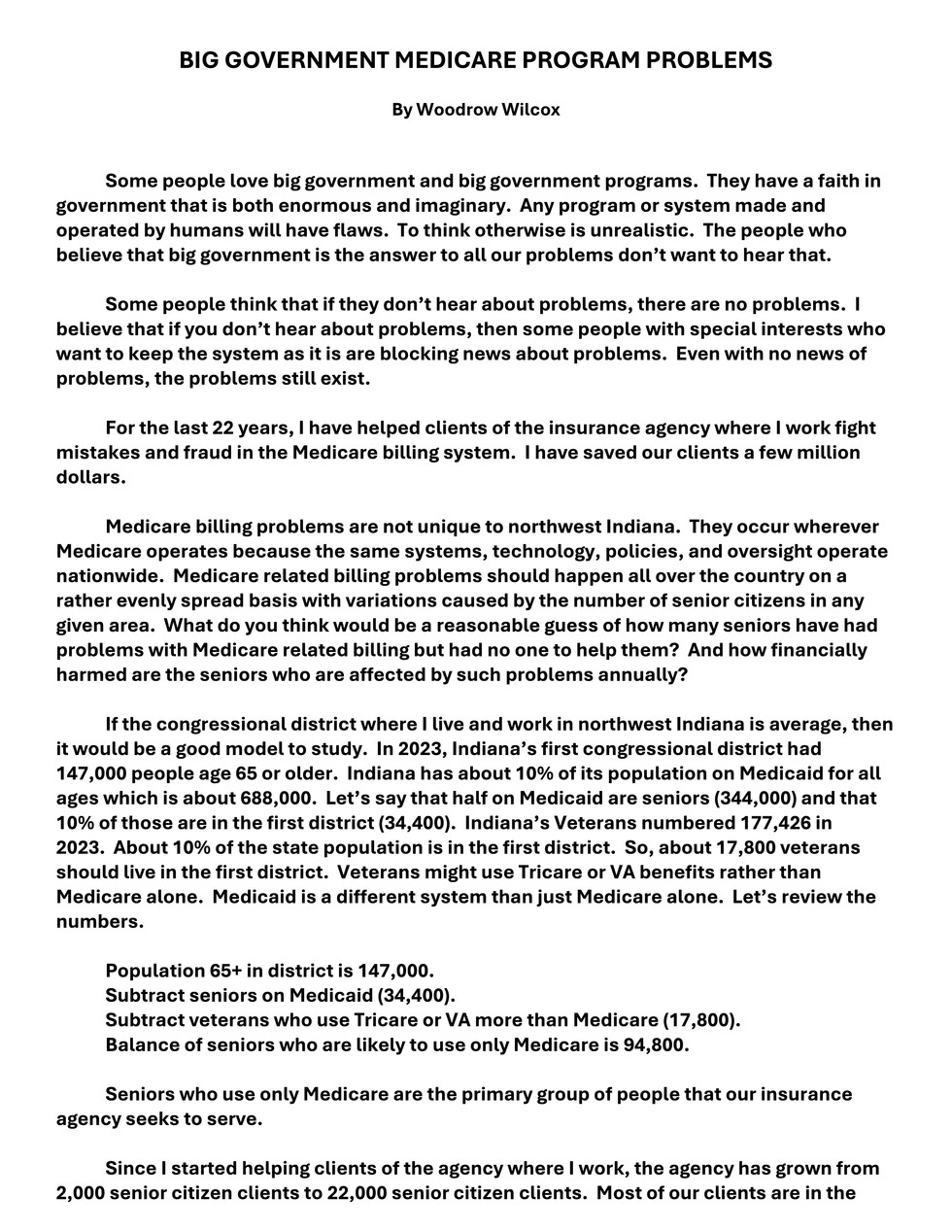 If the congressional district where I live and work in northwest Indiana is average, then it would be a good model to study. In 2023, Indiana’s first congressional district had 147,000 people age 65 or older. Indiana has about 10% of its population on Medicaid for all ages which is about 688,000. Let’s say that half on Medicaid are seniors (344,000) and that 10% of those are in the first district (34,400). Indiana’s Veterans numbered 177,426 in 2023. About 10% of the state population is in the first district. So, about 17,800 veterans should live in the first district. Veterans might use Tricare or VA benefits rather than Medicare alone. Medicaid is a different system than just Medicare alone. Let’s review the numbers.